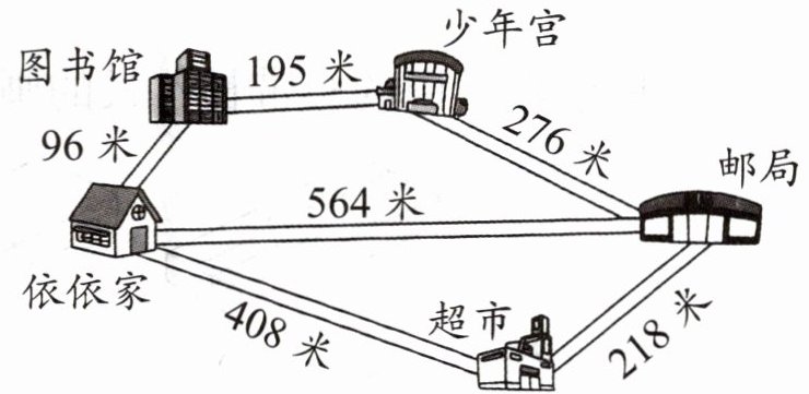 3. 星期六上午,依依要从家出发先去图书馆借书,再去少年宫画画,然后去邮局寄信,最后回家。依依可以怎样走?走哪条路最近?