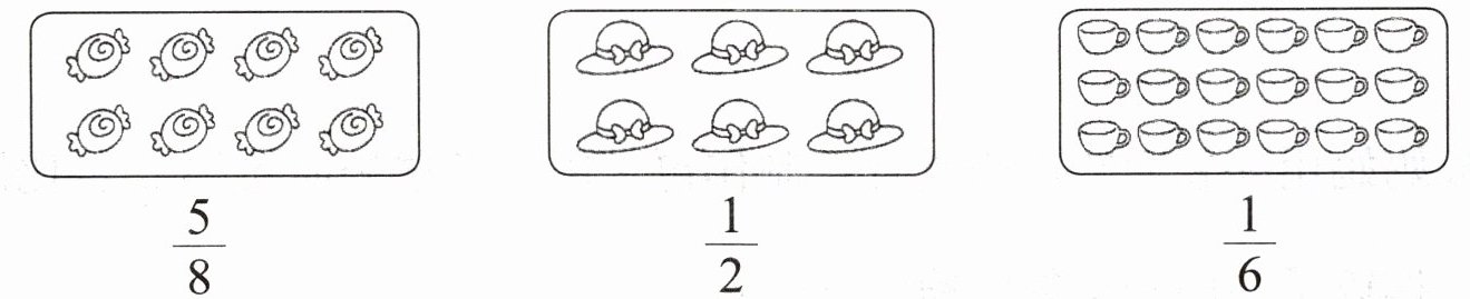 2. 第二幅图有6顶帽子,涂色3顶表示 $\dfrac{1}{2}$(取整数部分,6×$\dfrac{1}{2}$=3)。