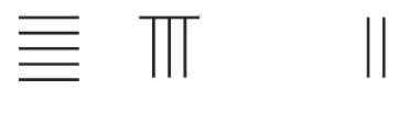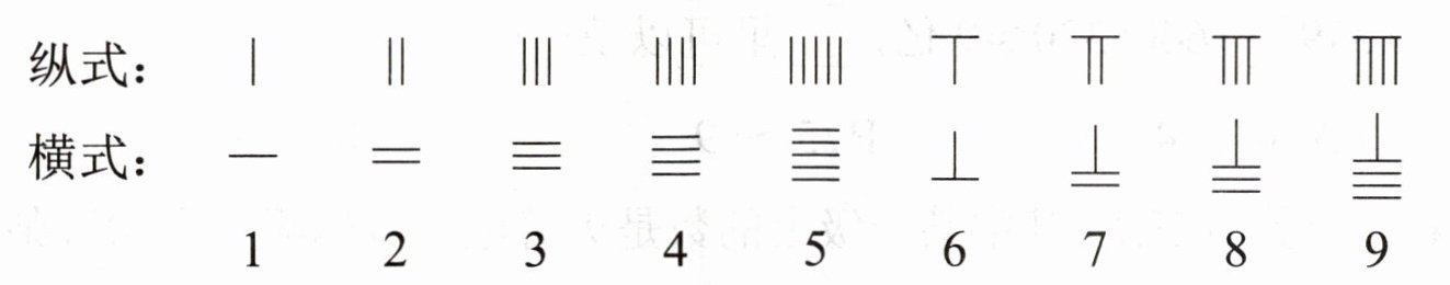 算筹计数的表示方法为:个位用纵式,十位用横式,百位再用纵式,千位再用横式……照此类推来表示任何自然数,遇零用空位表示。如: