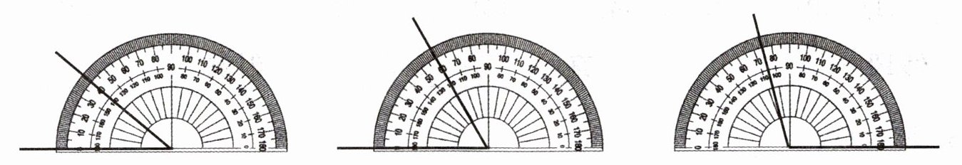 1. 下面角中最大的是$∠1$,最小的是$∠2$,请在图中标出来;并分别量出三个角的度数,填在括号里。