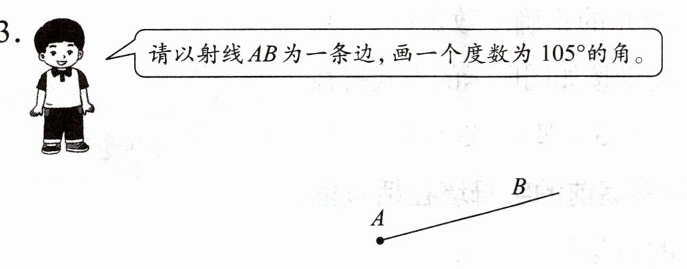 1. 以点 $A$ 为顶点,射线 $AB$ 为一条边,用量角器画出 $105°$ 的角,使另一边在射线 $AB$ 的上方。