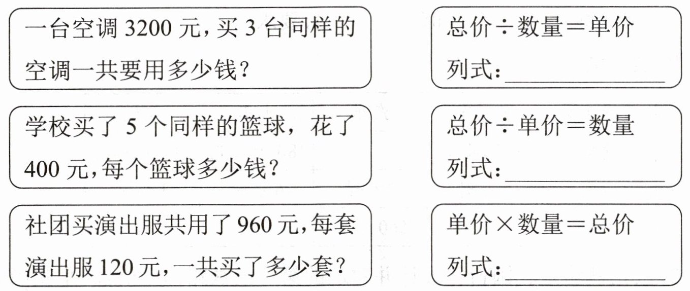 |一台空调3200元,买3台同样的空调一共要用多少钱?|总价÷数量= 单价