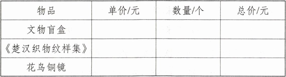 3. 周日李叔叔到湖南省博物馆参观,临走时买了一些礼物准备送给朋友们。他买了3个文物盲盒,共花120元;8本《楚汉织物纹样集》,每本30元;4个花鸟铜镜,共花132元。请你将信息填入下表,再将表格补充完整。
