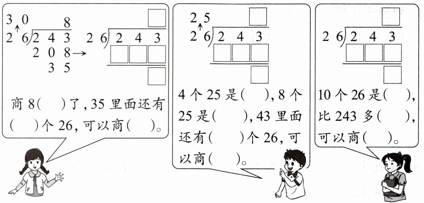 2. 下面是三位同学计算“$243÷26$”的思考过程,请补充完整。