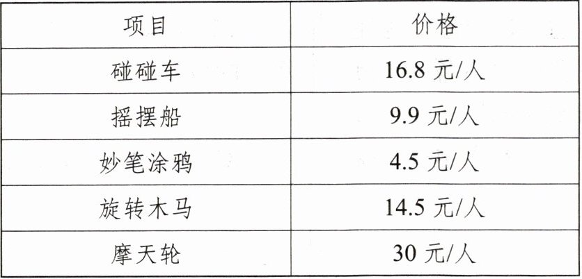 100÷(1+3)=25(元) 答案不唯一,如: 方案一:9.9+14.5=24.4(元) 24.4<25 他们可以一起去玩一次摇摆船和一次旋转木马 方案二:16.8+4.5=21.3(元) 21.3<25 他们可以一起去玩一次碰碰车和一次妙笔涂鸦