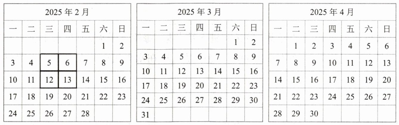 我在 2 月的日历上圈出了这样的 4 个数,你能照样子也在 3 月和 4 月的日历上圈出几组这样的 4 个数吗?观察 4 个数之间的数量关系,用含有字母的式子来表示。