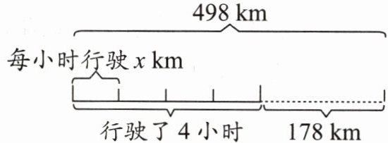 答案不唯一,例:甲、乙两地之间相距498km,一辆小汽车以每小时x km的速度从甲地向乙地出发,4小时后,距乙地还有178km,求小汽车的平均速度。