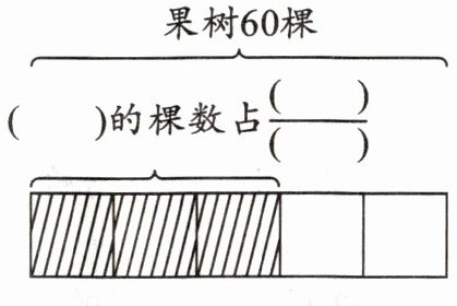 (2)方法1:桃树有多少棵? $60×\frac{3}{5}=36$(棵) 黄桃树有多少棵? $36×\frac{1}{3}=12$(棵) 方法2:黄桃树占果树的多少 $\frac{3}{5}×\frac{1}{3}=\frac{1}{5}$ 黄桃树有多少棵? $60×\frac{1}{5}=12$(棵)