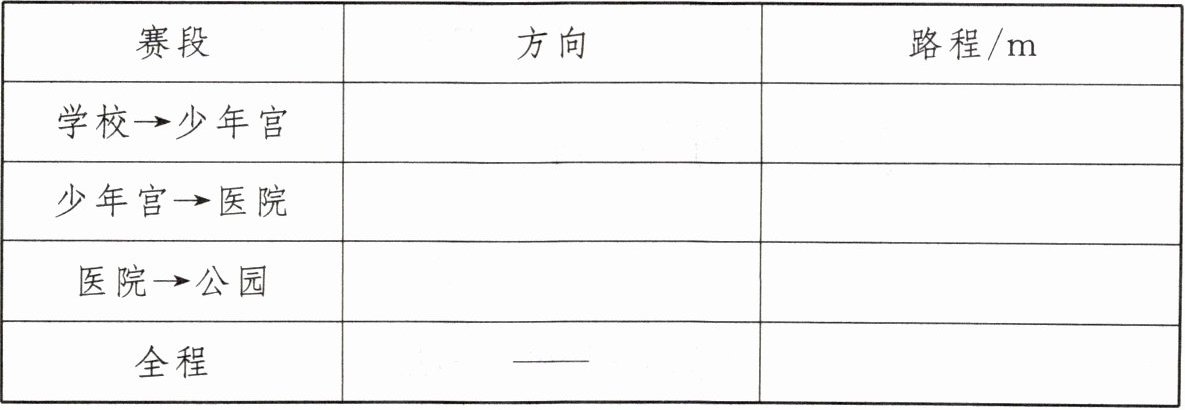 (1) 根据上面的路线图,说一说每一赛段的方向和路程,并完成下表。(7分)