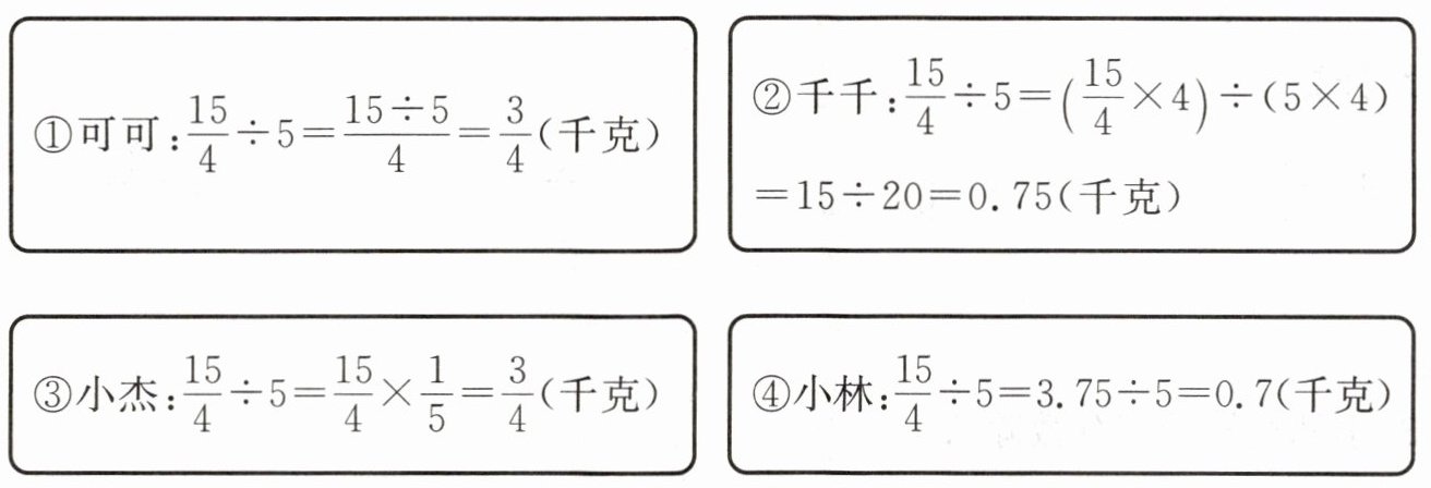 根据分数除法的计算方法$\frac{a}{b}÷ c=\frac{a÷ c}{b}(b\neq0,c\neq0)$,对于$\frac{15}{4}÷5$,这里$a = 15$,$b = 4$,$c = 5$,$\frac{15}{4}÷5=\frac{15÷5}{4}=\frac{3}{4}=0.75$(千克),可可的解法正确。