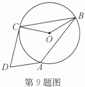 9. 如图,$\odot O$ 中,$\overset{\frown}{AB}= \overset{\frown}{CB}$,过点 $A$ 作 $BC$ 的平行线,交过点 $C$ 的圆的切线于点 $D$,若 $\angle ABC = 46^{\circ}$,则 $\angle ADC$ 的度数为______。