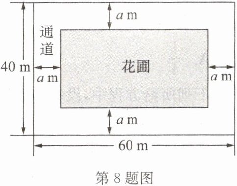 8. 如图,为了美化校园环境,某校计划在一块长为 60 m、宽为 40 m 的矩形空地上修建一个矩形花圃,并将花圃四周余下的空地修建成同样宽的通道,设通道的宽为 a m. 如果通道所占面积是整个矩形空地面积的$\frac{3}{8}$,求通道的宽.