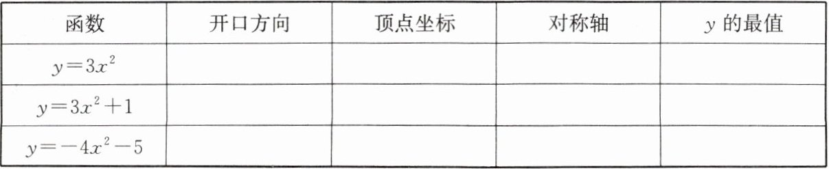 | $y = 3x^2 + 1$ | 向上 | $(0,1)$ | $x=0$($y$轴) | 最小值 $1$ |