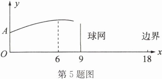 5. 如图,排球运动员站在点$O$处练习发球,将球从点$O正上方2m的A$处发出,把球看成点,其运行的高度$y$(单位:$m$)与运行的水平距离$x$(单位:$m$)满足$y = a(x - 6)^{2}+h$。已知球网与点$O的水平距离为9m$,高度为$2.43m$,球场的边界距点$O的水平距离为18m$。