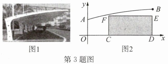 3. 图1所示为一汽车停车棚,其棚顶的横截面可以看作是抛物线的一部分。图2所示是棚顶的竖直高度$y$(单位:$m$)与距离停车棚支柱$AO的水平距离x$(单位:$m$)近似满足的函数关系$y = - 0.02x^{2}+0.3x + 1.6$的图象,点$B(6,2.68)$在图象上。若一辆箱式货车需在停车棚下避雨,货车截面看作长$CD = 4m$,高$DE = 1.8m$的矩形,则可判定此货车____完全停到车棚内(填“能”或“不能”)。