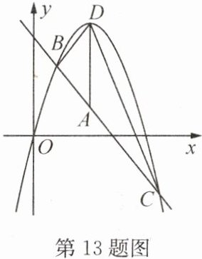 13. 如图,经过定点 $ A $ 的直线 $ y = k(x - 2) + 1 $($ k < 0 $)交抛物线 $ y = -x^{2} + 4x $ 于 $ B $,$ C $ 两点(点 $ C $ 在点 $ B $ 的右侧),$ D $ 为抛物线的顶点。