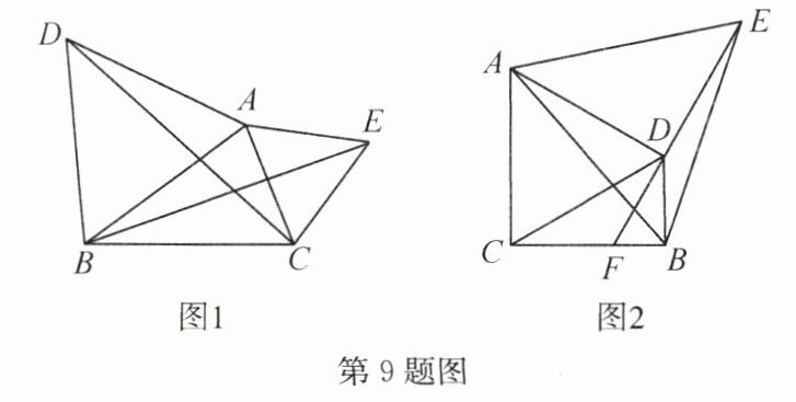 9. 【问题背景】(1)如图1,$\triangle ABD$,$\triangle AEC$都是等边三角形,$\triangle ACD由\triangle AEB$通过旋转变换得到,请写出旋转中心、旋转方向及旋转角的大小.