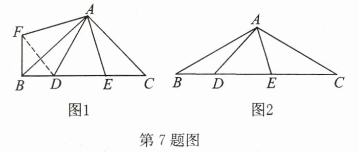 7. (1)如图1,在$\triangle ABC$中,$\angle BAC = 90^{\circ}$,$AB = AC$,$D$,$E在BC$上,$\angle DAE = 45^{\circ}$,为了探究$BD$、$DE$、$CE$之间的等量关系,现将$\triangle AEC绕点A顺时针旋转90^{\circ}后成\triangle AFB$,连接$DF$,经探究,你所得到的$BD$,$DE$,$CE$之间的等量关系式是______;