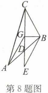 8. 如图,已知 $ DA = DB $,$ CG = 2GD $,$ GA = 5 cm $,$ GC = 4 cm $,$ GB = 3 cm $,将 $ \triangle ADG $ 绕点 $ D $ 旋转 $ 180° $ 得到 $ \triangle BDE $,则 $ DE = $______ $ cm $,$ \triangle ABC $ 的面积为______ $ cm^2 $。