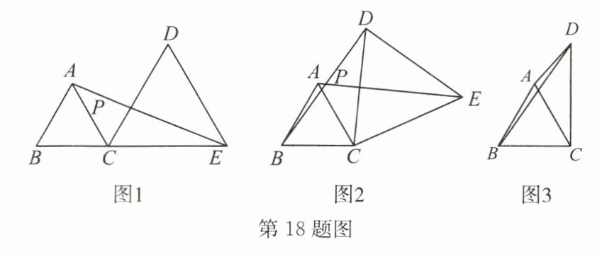 (1)如图1,$\triangle ABC和\triangle CDE$都是等边三角形,且点B,C,E在一条直线上,线段BD和AE相交于点P,线段BD与AE有什么关系?你能用旋转的性质说明上述关系成立的理由吗?