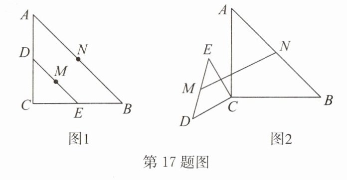 17. 如图1,一大一小两个等腰直角三角形叠放在一起,M,N分别是斜边DE,AB的中点,$DE = 2$,$AB = 4$。