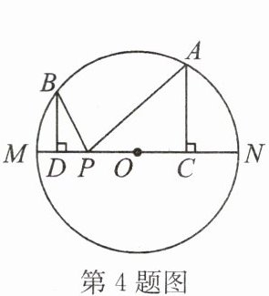 4. 如图,$MN$ 为 $\odot O$ 的直径,$A$、$B$ 是 $\odot O$ 上两点,过 $A$ 作 $AC \perp MN$ 于点 $C$,过 $B$ 作 $BD \perp MN$ 于点 $D$,$P$ 为 $DC$ 上任意一点,若 $MN = 20$,$AC = 8$,$BD = 6$,则 $PA + PB$ 的最小值是______.