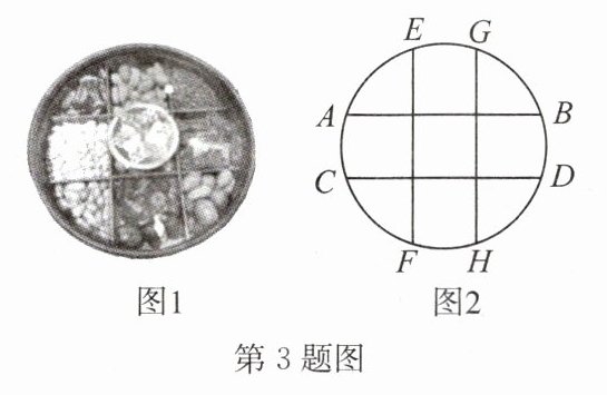 3. 如图,图 1 是圆形干果盘,其示意图如图 2 所示. 四条隔板 $AB$,$CD$,$EF$,$GH$ 的长度相等,横纵隔板互相垂直并交于隔板的三等分点,测得 $AB = 30\ cm$,则该干果盘的半径为______$cm$.