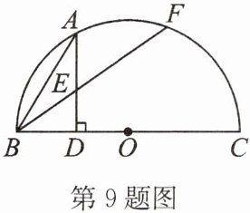 9. 如图,$BC$ 为 $\odot O$ 的直径,$AD \perp BC$,垂足为 $D$,$\overset{\frown}{AB} = \overset{\frown}{AF}$,$BF$ 和 $AD$ 相交于 $E$。试猜想 $AD$ 与 $BF$ 的长度之间的关系,并说明理由。