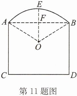 11. 如图所示,某窗户由矩形和弓形组成,已知弓形的跨度 $AB = 3\ m$,弓形的高 $EF = 1\ m$,现计划安装玻璃,请帮工程师求出 $\overset{\frown}{AB}$ 所在圆 $O$ 的半径 $r$。