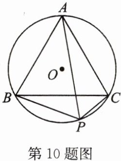 10. 如图,已知$\triangle ABC$是等边三角形,$\odot O$为它的外接圆,点$P是\overset{\frown}{BC}$上任一点.