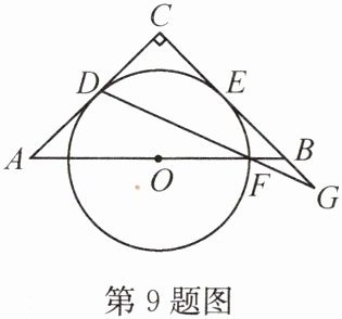 9. 如图,在$\triangle ABC$中,$AC = BC = 6$,$\angle C = 90^{\circ}$,$O是AB$的中点,$\odot O与AC$,$BC分别相切于点D与点E$,点$F是\odot O与AB$的一个交点,连接$DF并延长交CB的延长线于点G$。