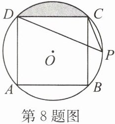 8. 如图,正方形 $ ABCD $ 内接于 $ \odot O $, $ P $ 为 $ \overset{\frown}{BC} $ 上的一点,连接 $ DP $, $ CP $。