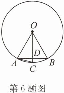 6. 如图,在 $ \odot O $ 中, $ OA = AB $, $ OC \perp AB $ 交 $ AB $ 于点 $ D $,若 $ OA = 10 $ cm,求 $ \odot O $ 的内接正十二边形的边长。