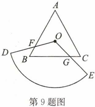 9. 如图,扇形 $ODE$ 的圆心角为 $120^{\circ}$,正三角形 $ABC$ 的中心恰好为扇形 $ODE$ 的圆心,且点 $B$ 在扇形 $ODE$ 内.
