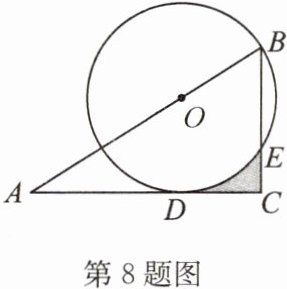 8. 如图,在 $\mathrm{Rt}\triangle ABC$ 中,$\angle C = 90^{\circ}$,$\angle A = 30^{\circ}$,点 $O$ 在斜边 $AB$ 上,半径为 $2$ 的 $\odot O$ 过点 $B$,切 $AC$ 于点 $D$,交 $BC$ 边于点 $E$,求线段 $CD$,$CE$ 及 $\overset{\frown}{DE}$ 围成的阴影部分的面积.