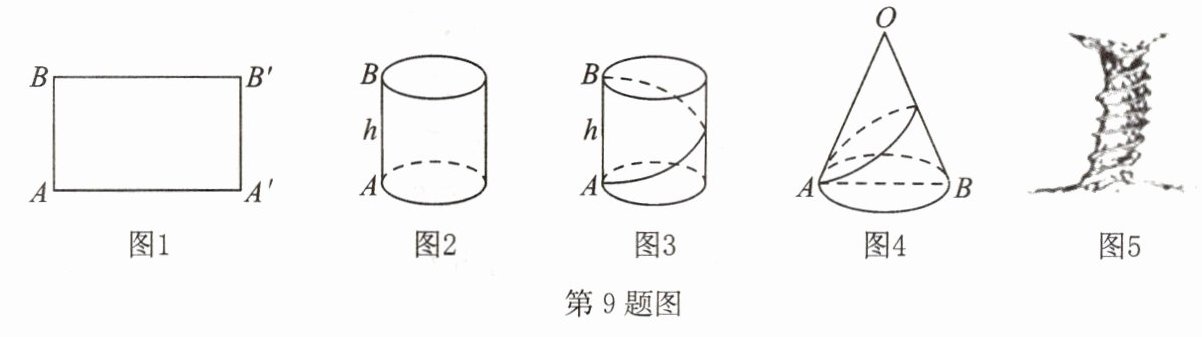 9. (1)如图1、图2,把长为$l$、宽为$h的矩形卷成以AB$为高的圆柱,则点$A$与点______重合,点$B$与点______重合;