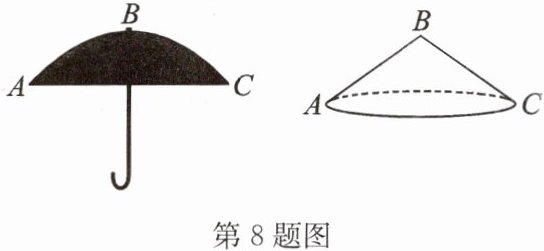 8. 如图,一把打开的雨伞可近似看成一个圆锥,伞骨(面料下方能够把面料撑起来的支架)末端各点所在圆的直径$AC$长为15 dm,伞骨$AB$长为9 dm,现有半径为9 dm的一个圆形面料经裁剪可用作伞布.