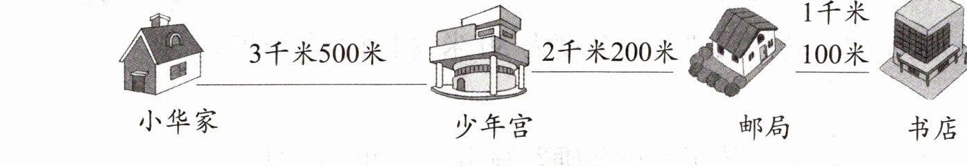 小华家 3千米500米 少年宫 2千米200米 邮局 1千米 100米 书店