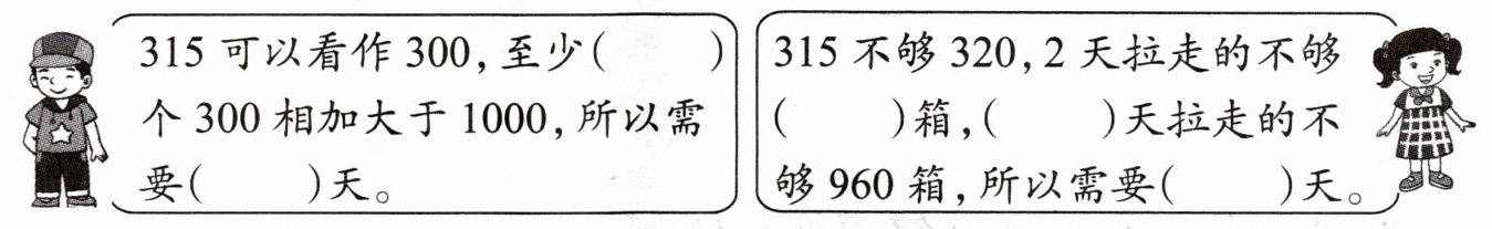 (2)①(从左到右,从上到下) 2 3 4 630 945 1260 ②315+315+315+315=1260(箱) 1260>1000 4