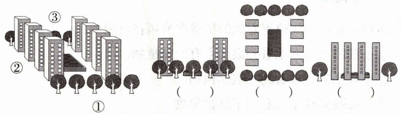 2. 笑笑用无人机拍摄了自己家所在小区的全貌。下面三幅图分别是从哪个位置拍到的?(填序号)