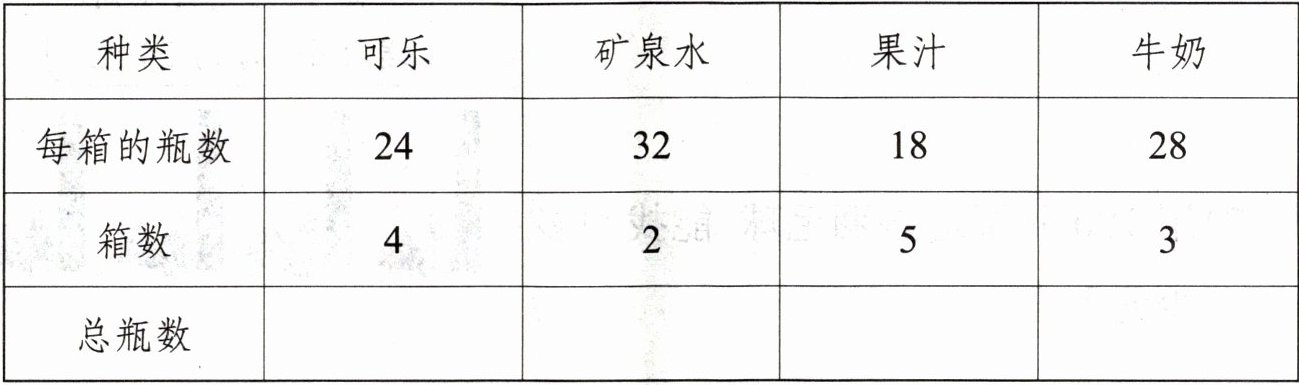 3. 下面是某商店某天的进货情况,请算出每种饮料的进货瓶数。