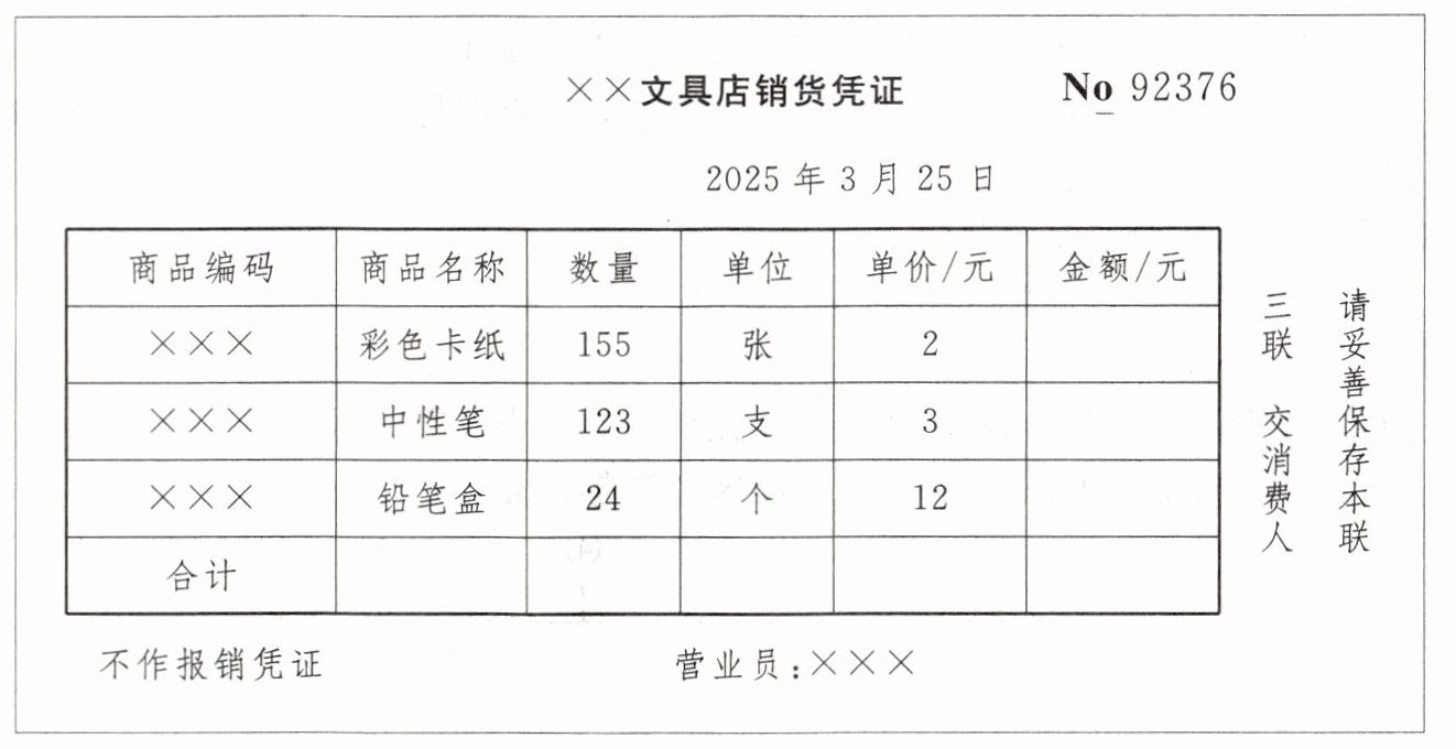2. 下面是一张购买文具的收据,请填出相应的金额。先笔算,再用计算器验算。