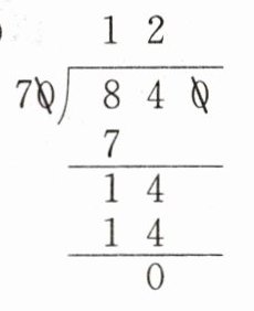 \begin{array}{r}12 \\70\enclose{longdiv}{840} \\7 \\\hline14 \\14 \\\hline0\end{array} $