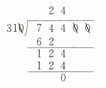 $\begin{array}{r}24 \\310\enclose{longdiv}{74400} \\62 \\\hline124 \\124 \\\hline0\end{array} $