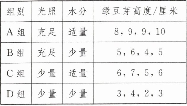 2. 小明想探究绿豆芽的生长与光照和水分的关系。绿豆发芽后,他把绿豆芽分为 4 组,每组 4 株,采用不同的光照和水分继续培养,其他条件保持一致。一周后,他分别测量了各组绿豆芽的高度,具体情况如右表: