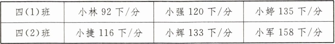 | 四(2)班 | 小捷 116 下/分 | 小辉 133 下/分 | 小军 158 下/分 |