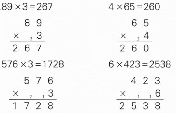 $\begin{array}{r}8\ 9 \\×\ \ \ ₂3 \\\hline2\ 6\ 7\end{array}$ $\begin{array}{r}6\ 5 \\×\ \ \ ₂4 \\\hline2\ 6\ 0\end{array}$
