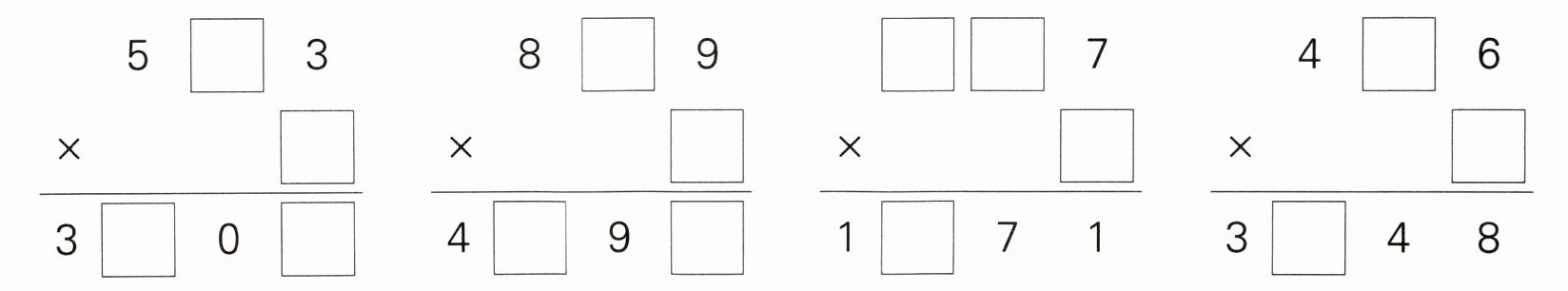 [解析]本题主要运用推理解决乘法竖式谜问题。以第一个算式为例,五百多乘一位数的积是三千多,则这个一位数可能是6或7。当一位数是6 时,三位数的个位3乘6得18,向十位进1,再想几乘6的积加1的结果是整十数,此处不成立,所以这个一位数只能是7。再用5□3的个位3乘7 得21,积的个位是1,向十位进2,想想几乘7的积加2的结果是整十数,4×7+2=30,所以三位数的十位上是4,最后求543×7的积即可。