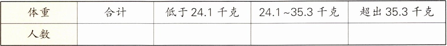 1. 新情境2025健康管理年,根据相关数据,我国8~9岁女生的标准体重范围为24.1~35.3千克,芳芳调查了三(1)班女生的体重情况,具体如下。请根据调查数据,完成下面的统计表。