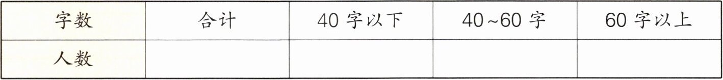 2. 每位同学都准备了一份简短的中秋贺词,下面是每份贺词的字数统计情况(单位:字),请根据字数统计情况完成下面统计表。